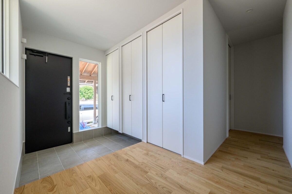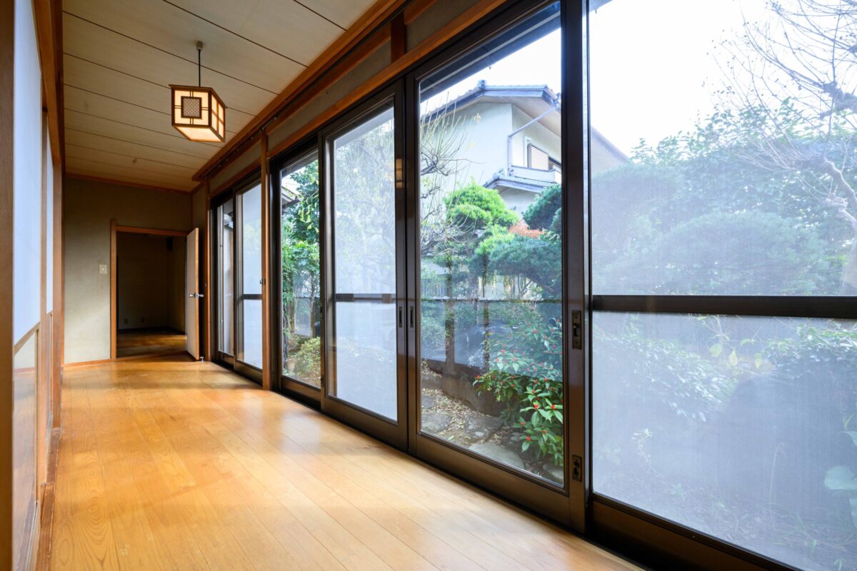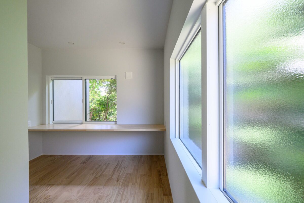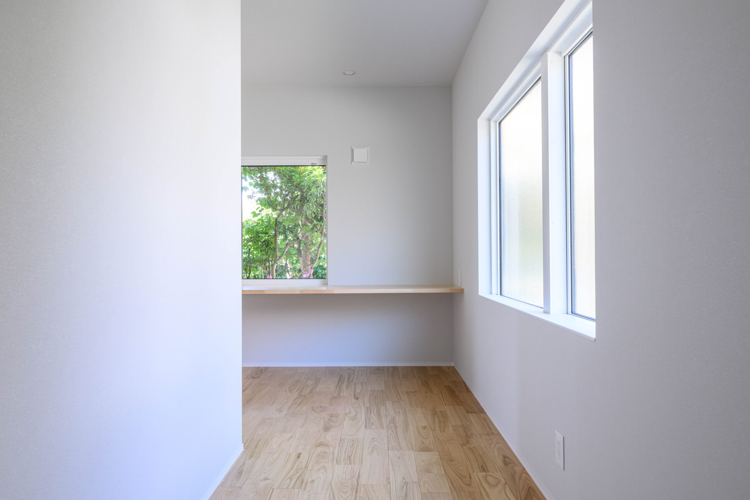 • ただの通路ではなく、心地よい居場所として。 白い壁に囲まれた空間に、一点の絵画のように美しい、庭の緑を切り取る正方形の窓を配置。 対面する大きなすりガラス窓からは、やわらかな光が室内に広がり、木の床の温かみを引き立てます。 実例ならではの、緻密な光の設計が光る一枚です。