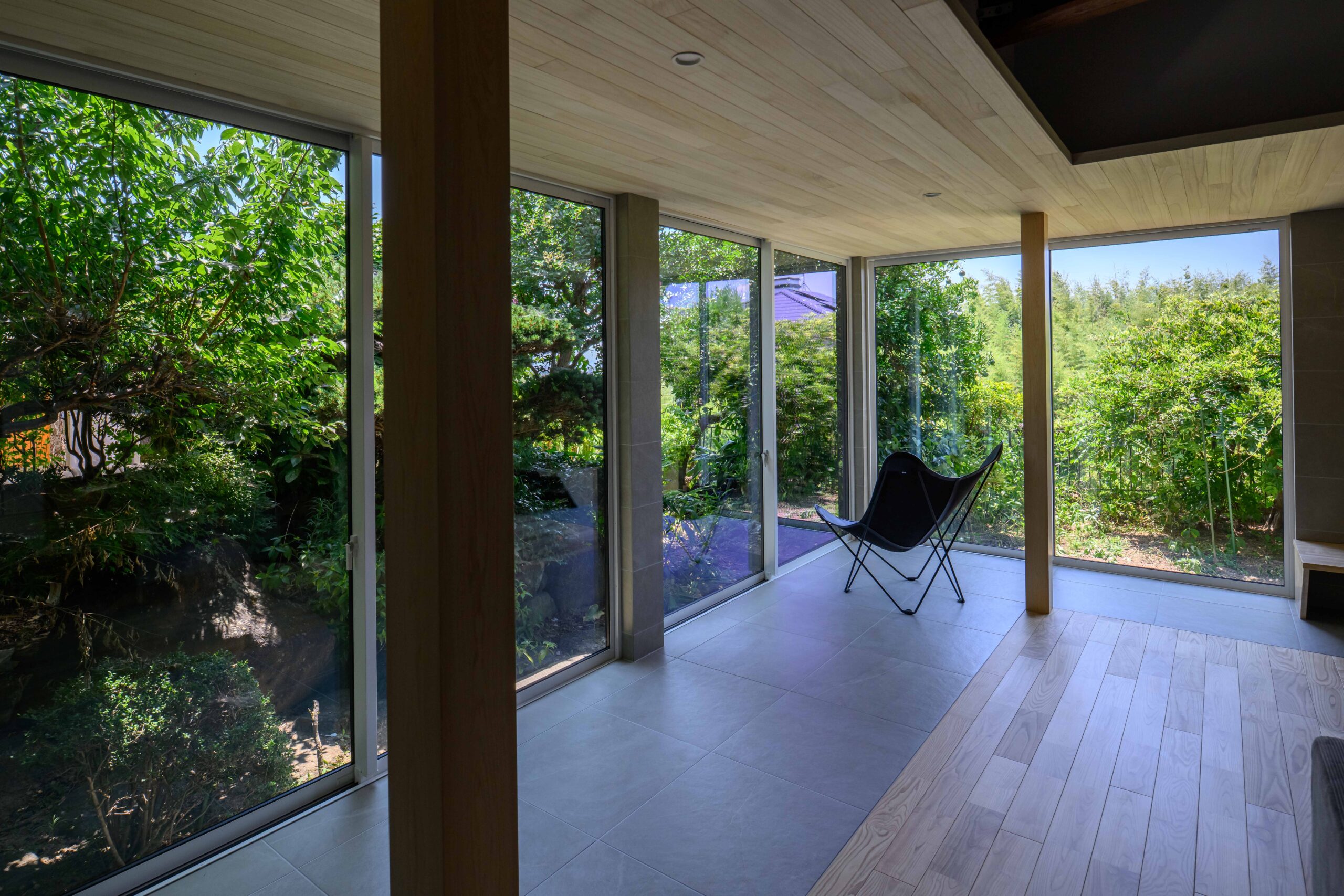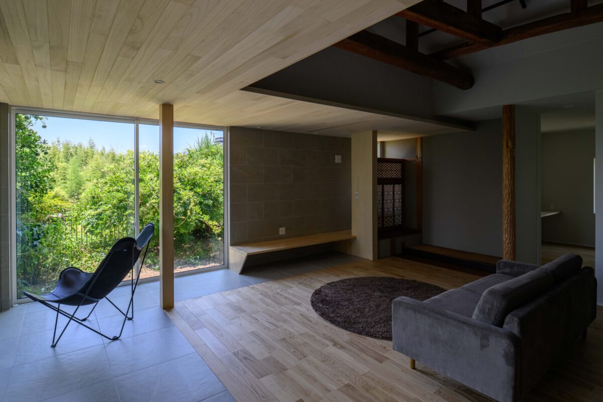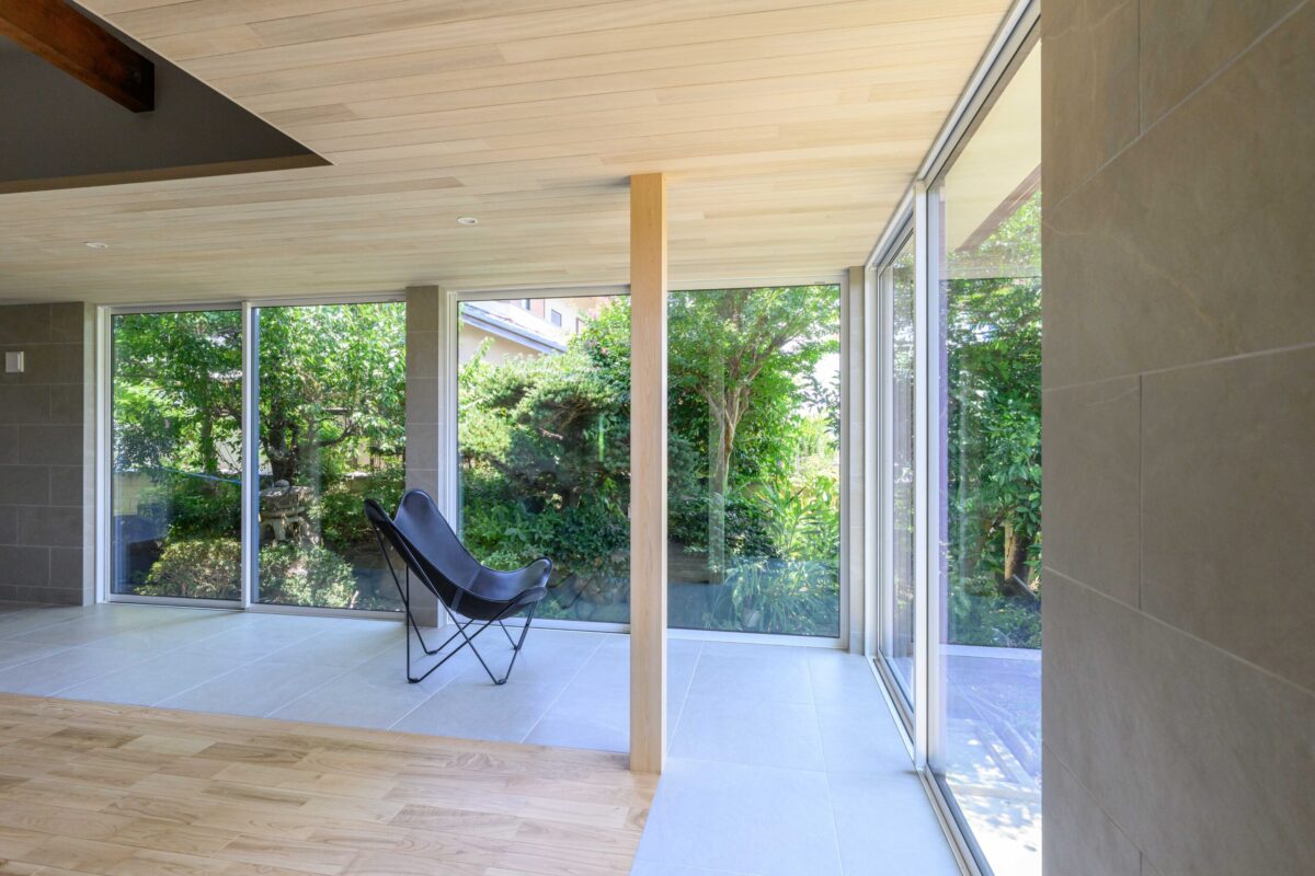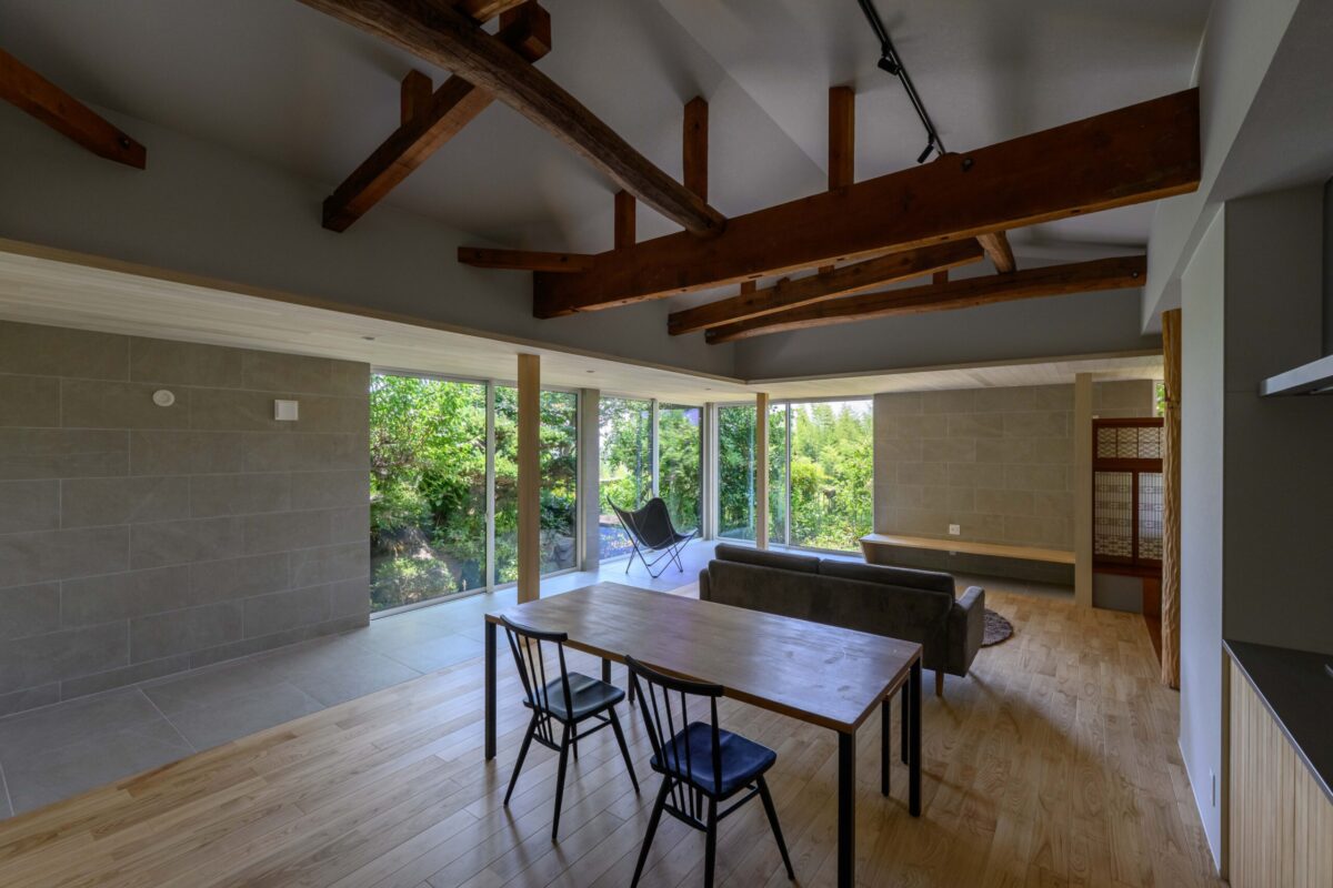 • 既存の庭の緑を絵画のように切り取る、パノラマのような大開口窓。天井を抜いて現れた迫力ある梁と、足元に広がるモダンなタイル床のコントラストが、和と洋、古さと新しさが調和する特別な空間を生み出します。