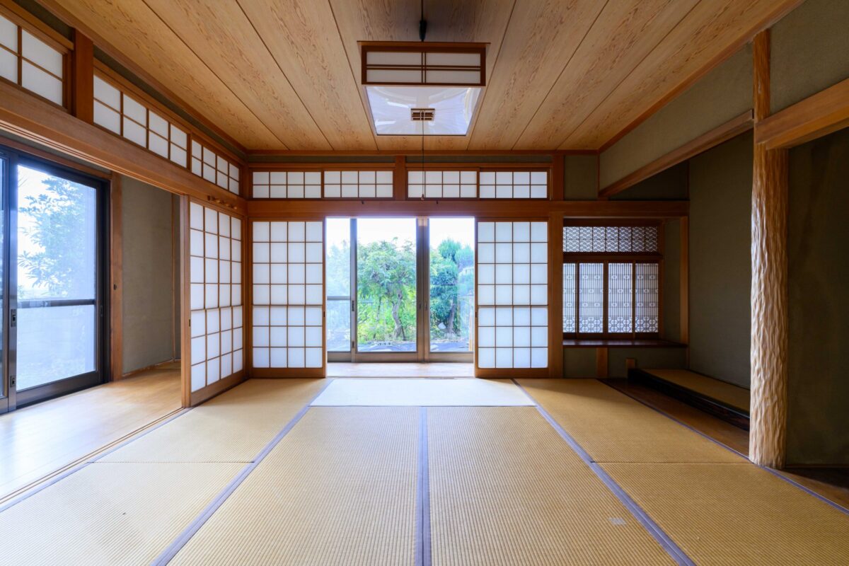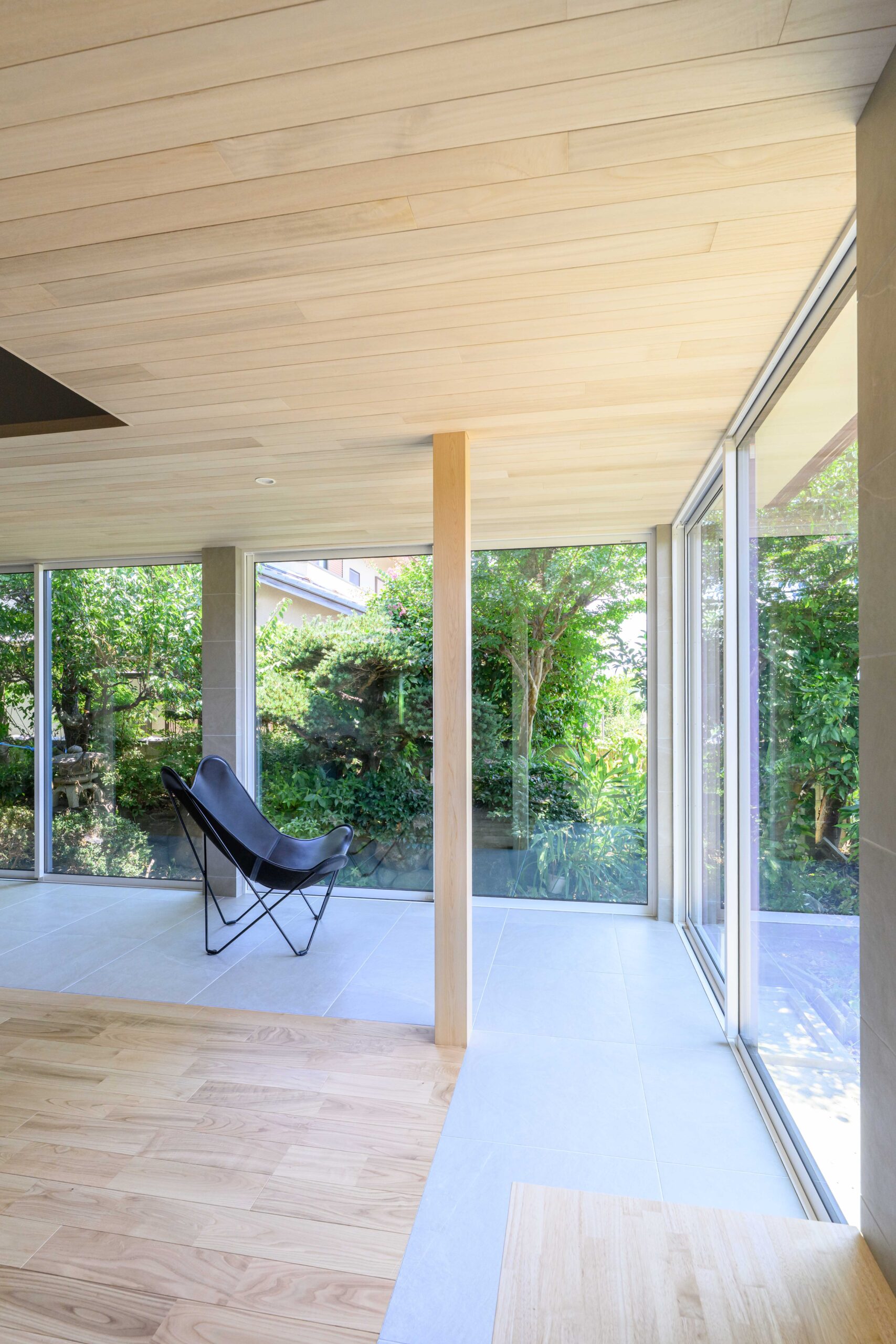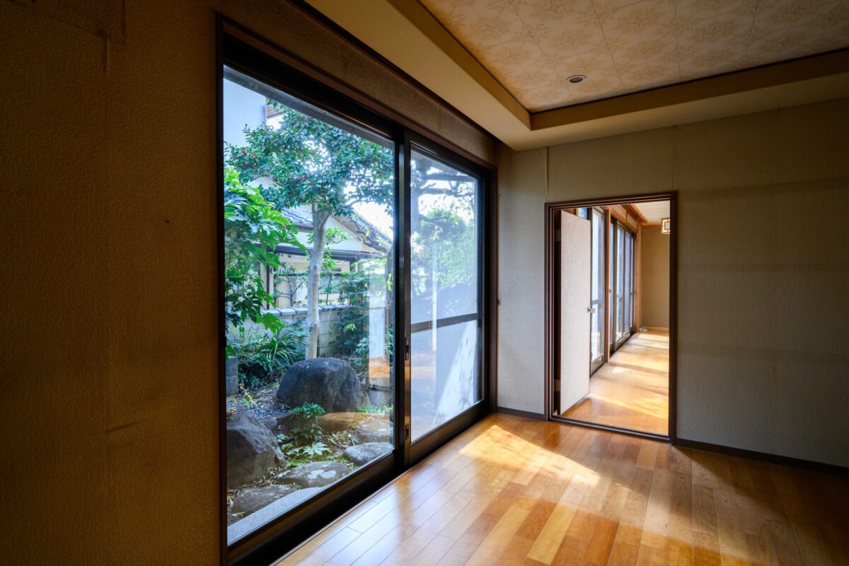 • 既存の庭の緑を絵画のように切り取る、パノラマのような大開口窓。天井を抜いて現れた迫力ある梁と、足元に広がるモダンなタイル床のコントラストが、和と洋、古さと新しさが調和する特別な空間を生み出します。
