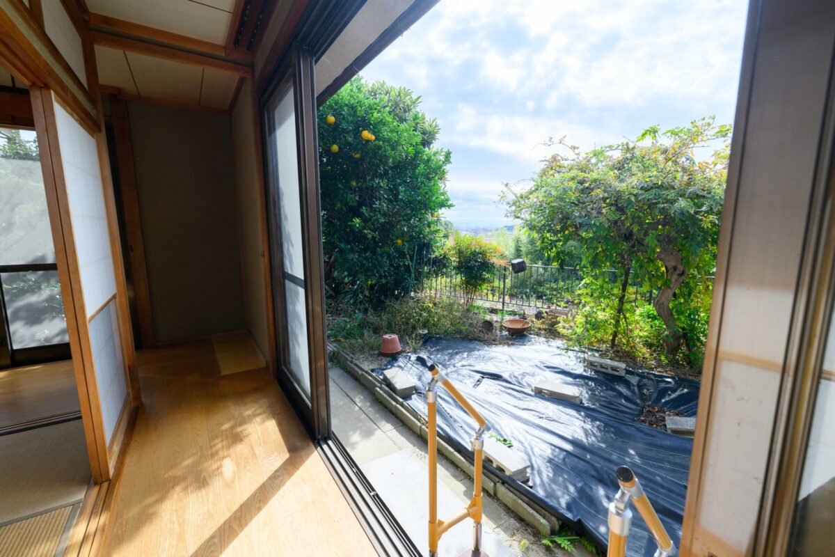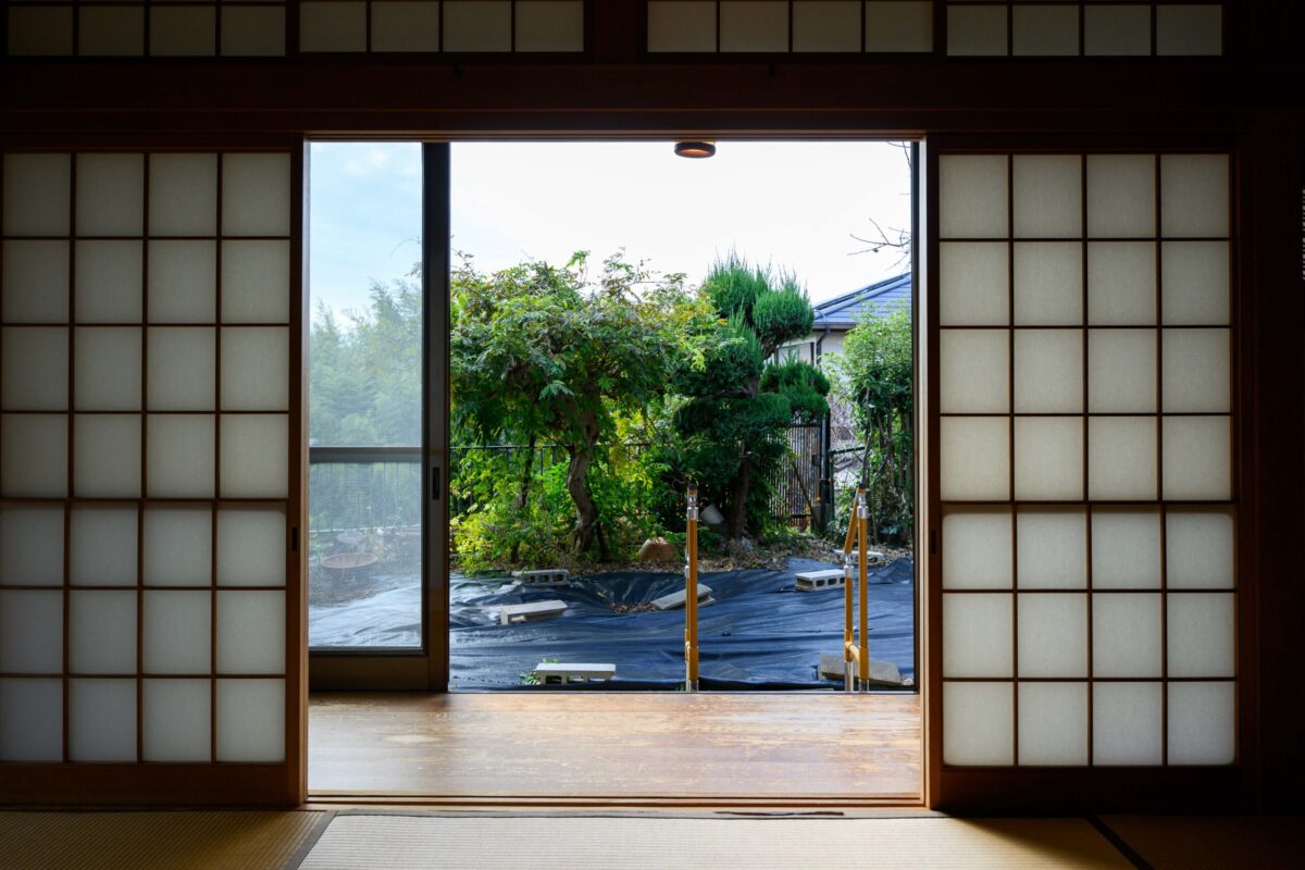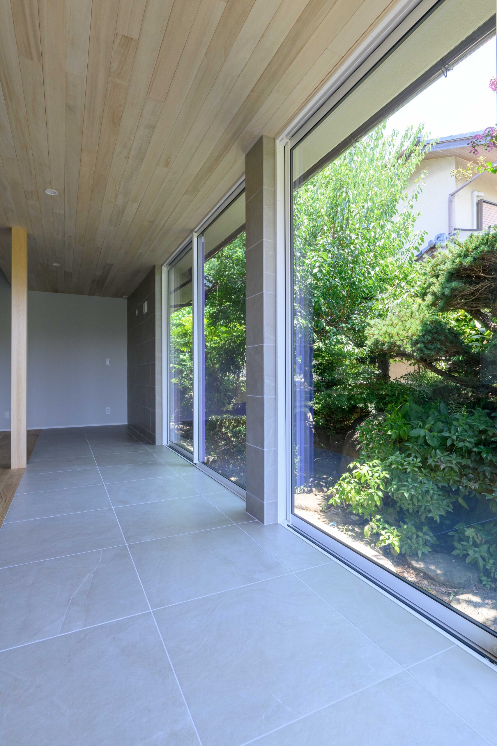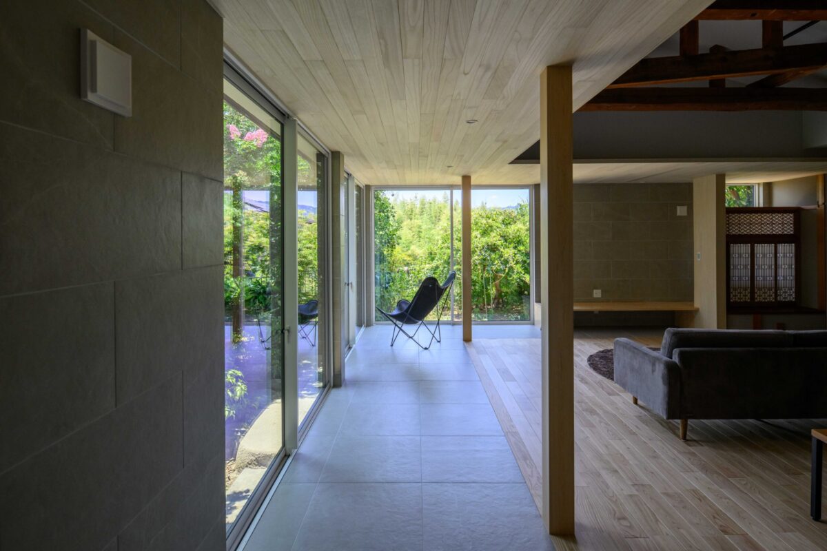 • 築45年の年月が育んだ立派な庭を、最大限に愉しむための設計。 壁一面を大開口の窓へと作り変え、室内と庭をタイル土間でフラットに繋ぎました。 軒先のような天井の木質感が、室内の安心感と外への開放感を同時に演出。 「実家をリノベーションする」ことの真価を、この景色が物語っています。