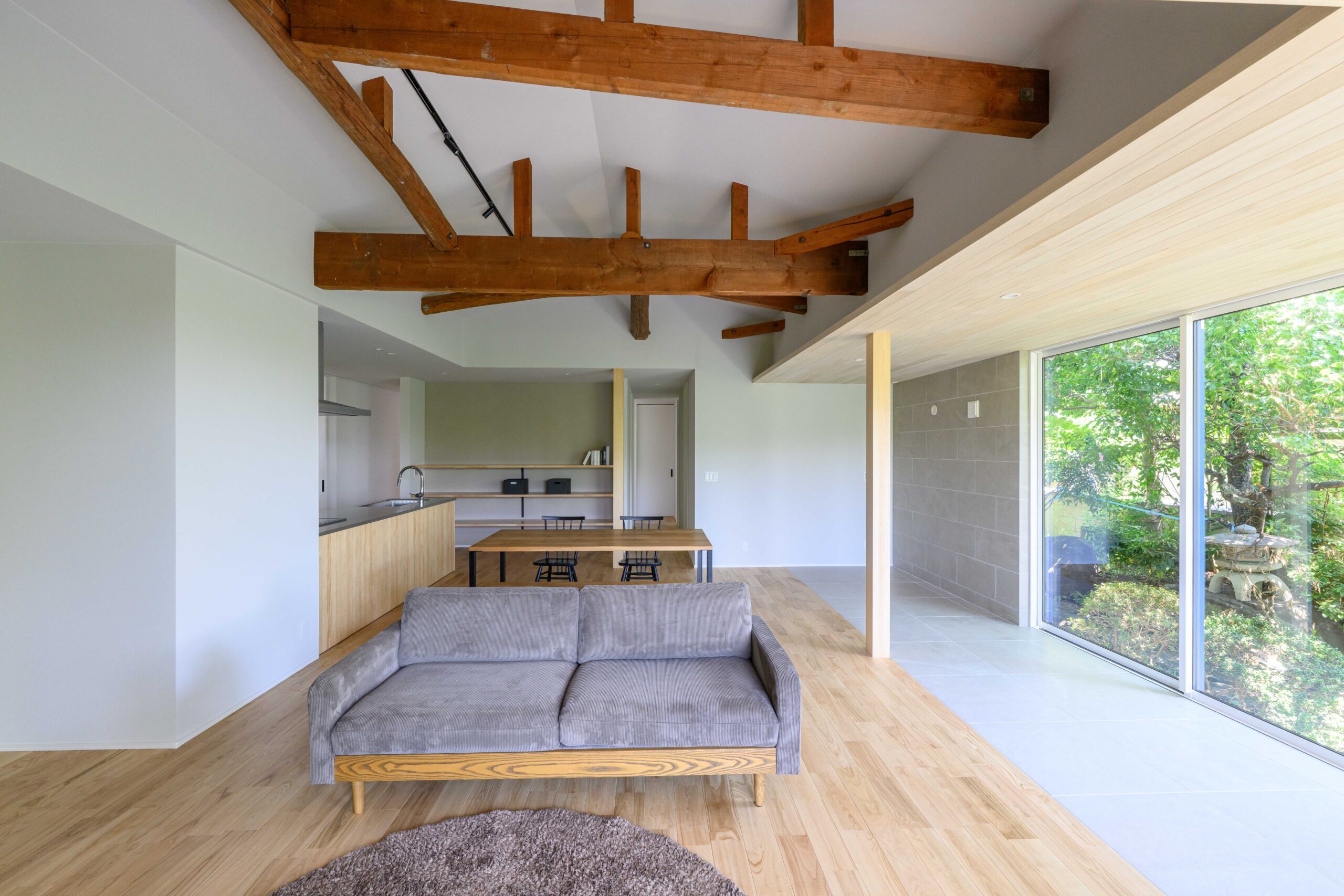 • 最大の特長は、天井を解体して現れた迫力のある既存の梁です。古民家のような趣を残しつつ、内壁を白で統一することで、モダンで洗練された印象に。リビングのフローリングからテラスの土間へと続く床材の切り替えが、奥行きと素材感のコントラストを生み出し、窓外に広がる豊かな緑を室内に取り込みます。